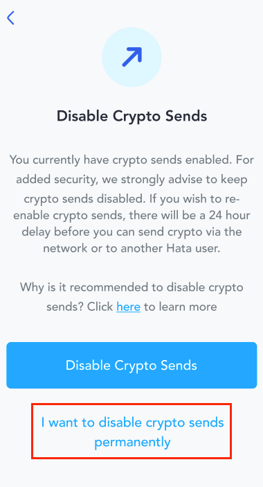 Alternatively, you can permanently disable crypto sends on your Hata account if you suspect your account has been compromised or if you don’t plan to use the crypto sends feature.